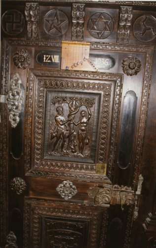 Rezljana vhodna vrata v prvo sobo, delo Lojzeta Kozjeka 1921